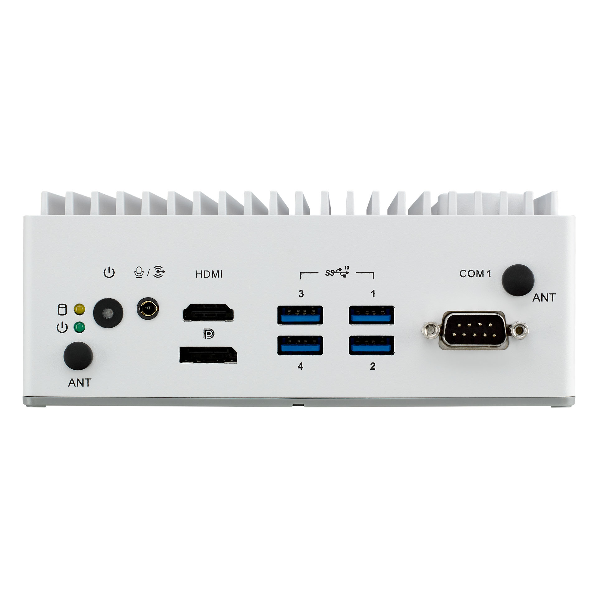 Trotz seiner geringen Baugröße verfügt der Embedded PC über eine große Anzahl an Schnittstellen, neben seinen beiden Gigabit Ethernet-Ports hat er zwei serielle und sechs USB Schnittstellen. Über die beiden Grafik-Interfaces - HDMI 2.0b und DisplayPort 1.4a - können zwei Displays parallel betrieben werden. Dank seines Arbeitstemperaturbereichs von -10 bis 50 Grad Celsius, des lüfterlosen Aufbaus und der großen Konnektivität eignet sich das System optimal für den Bereich Edge Intelligence.