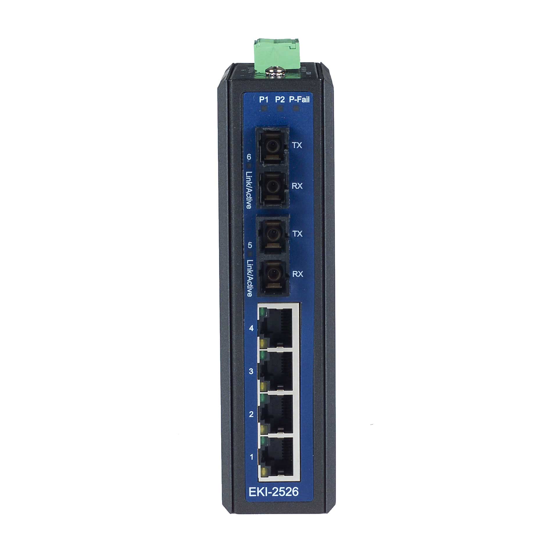 Der Unmanaged Ethernet Switch EKI-2526 besitzt vier Ethernet- und – je nach Variante - zwei 100Base-FX Multi-Mode oder zwei 100Base-FX Single-Mode Glasfaser Ports.