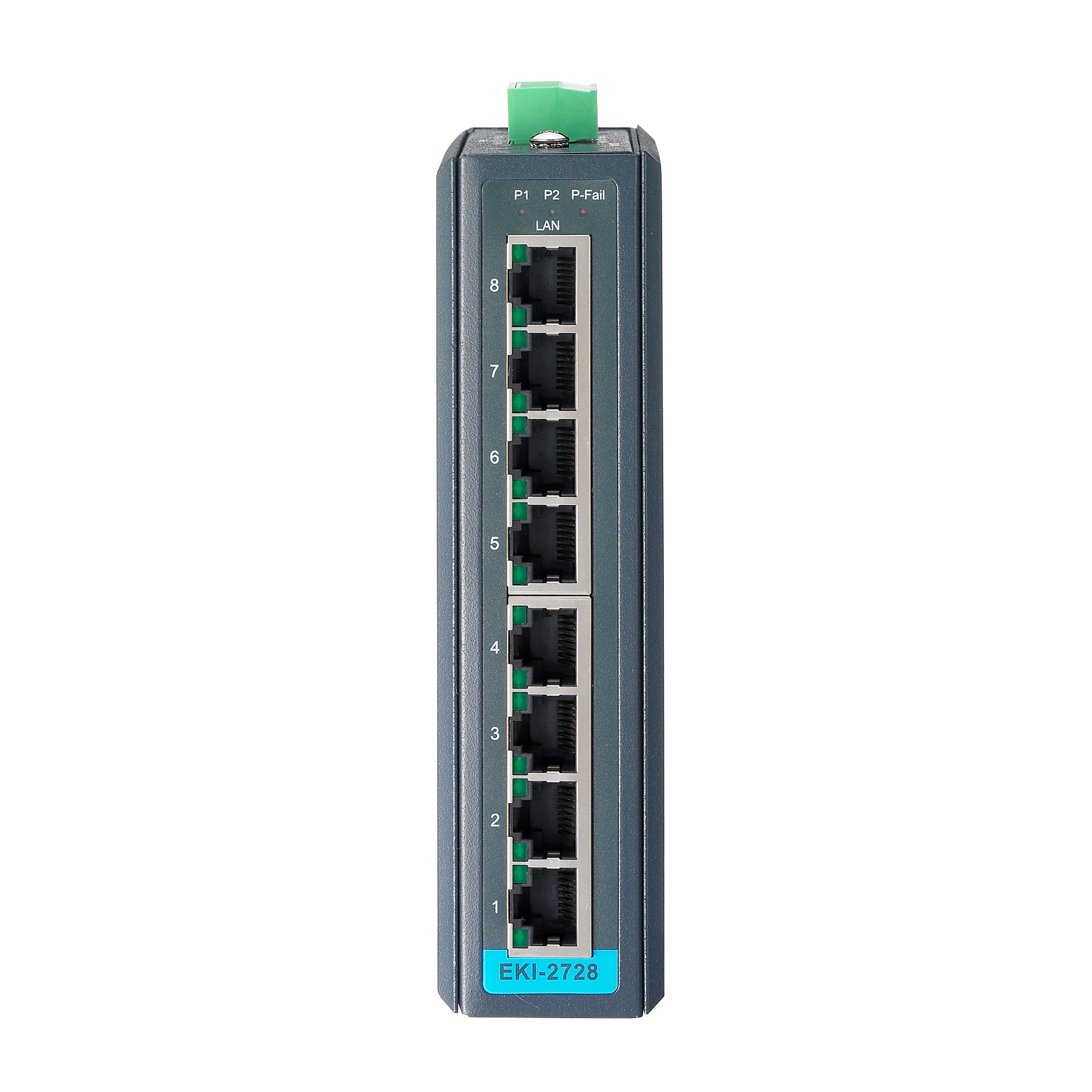 Die acht Ports haben jeweils zwei Status-LEDs, eine für den Transfer- und eine für den Kollisionsstatus. Der Switch unterstützt die Standards IEEE 802.3, 802.3u, 802.3x, 802.3ab. Er kann mit einer Versorgungsspannung von 12 bis 48 VDC betrieben werden. Ein unterbrechungsfreier Betrieb wird mit den beiden redundanten Anschlüssen, einem Verpolungsschutz sowie einem Schutz gegen Überlaststrom garantiert. Je nach Variante verfügt er über einen Betriebstemperaturbereich von -10 bis 60 °C oder von -40 bis 75 °C, was zusammen mit dem stabilen Metallgehäuse einen Einsatz des Unmanaged Ethernet Switch EKI-2728 im rauen industriellen Alltag ermöglicht.