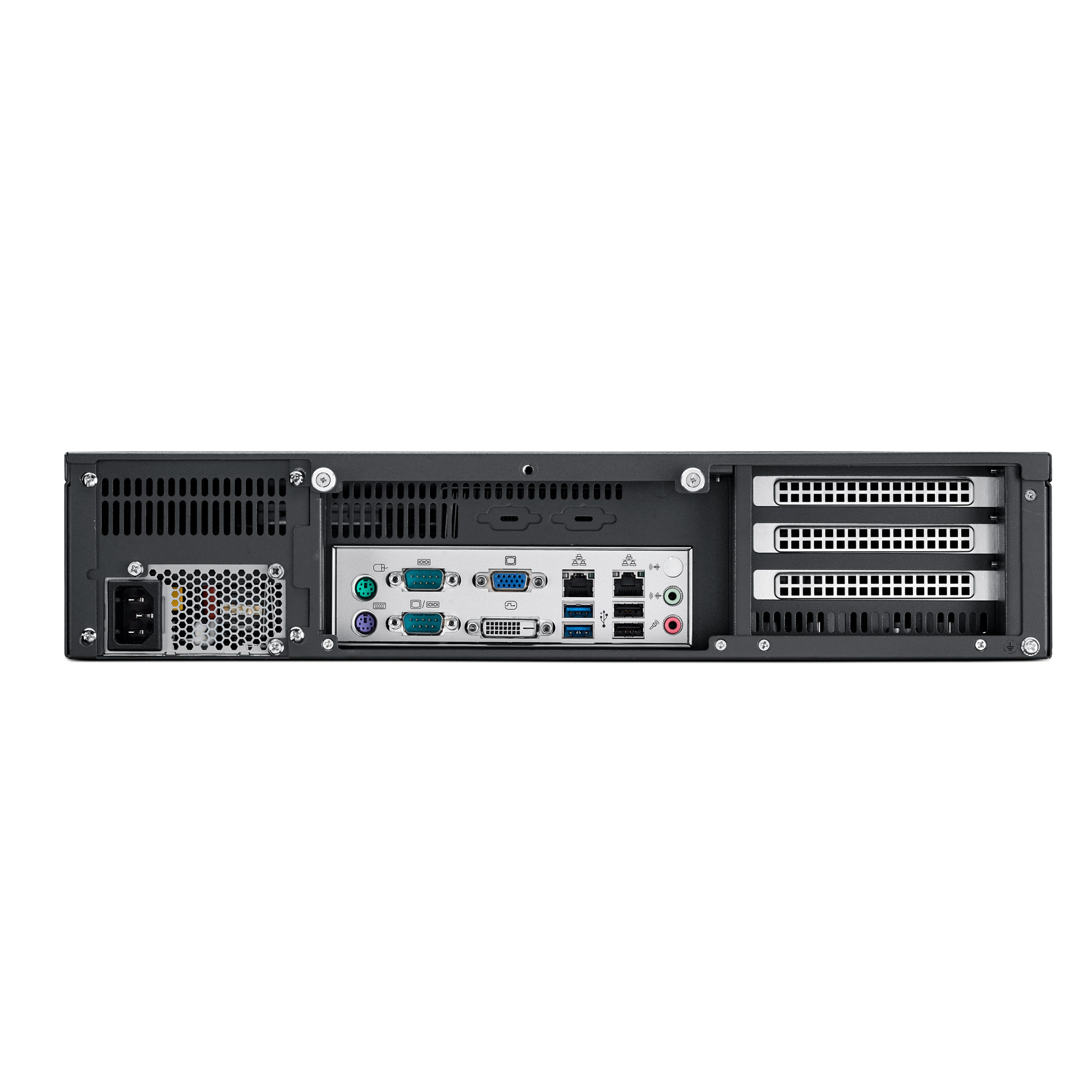 Es besitzt einen Slim Optical Disk und zwei 2,5" Laufwerksschächte. Intern können ebenfalls zwei 2,5" Festplatte installiert werden. Ein Front-Lüfter sorgen für den Abtransport der Wärme. Die Filtermatte des Lüfters kann bequem ausgetauscht werden, ohne das Gehäuse zu öffnen. An der Frontseite des Rackmount-PC-Chassis befinden sich Status-LEDs für LAN, HDD, Lüfter, Temperatur und Versorgungsspannung. Im Gehäuse verbaut ist etweder ein ATX 350 W 80+ Gold oder ein redundantes ATX 500 W 80+ Bronze Netzteil