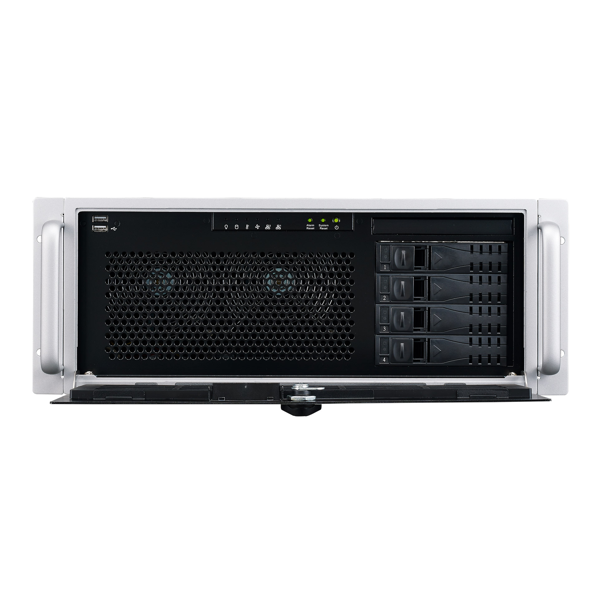 Es kann mit industriellen ATX Mainboards bestückt werden. Die Frontklappe ist abschließbar und erstreckt sich über die gesamte Gehäusebreite. Darunter sind die vier Schächte für die 3,5" Festplatten, die im Hot Swap Modus betrieben werden können. Zusätzlich finden sich hier zwei USB-Anschlüsse und ein Lüfter, inklusive austauschbaren Luftfilter. Um den Filter zu wechseln, muss das Gehäuse nicht geöffnet werden.