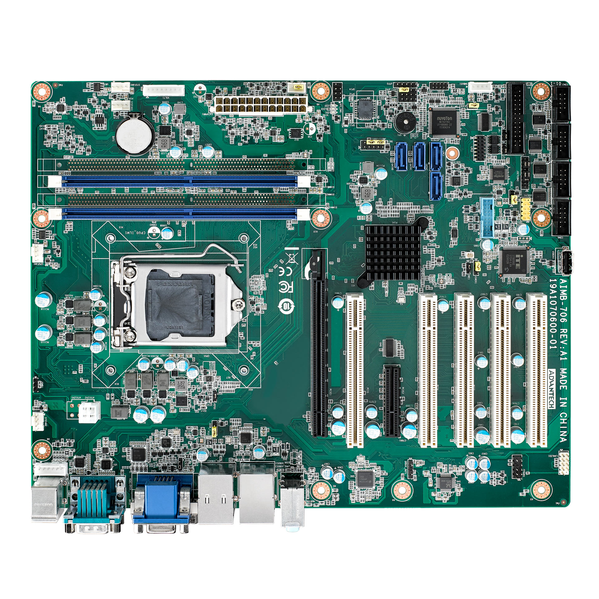 Das AIMB-706 ist ein industrielle ATX-Mainboard und kann mit den Intel Prozessoren Core i7, i5, i3 der achten Generation und den CPUs Pentium G54 und G49 ausgestattet werden.