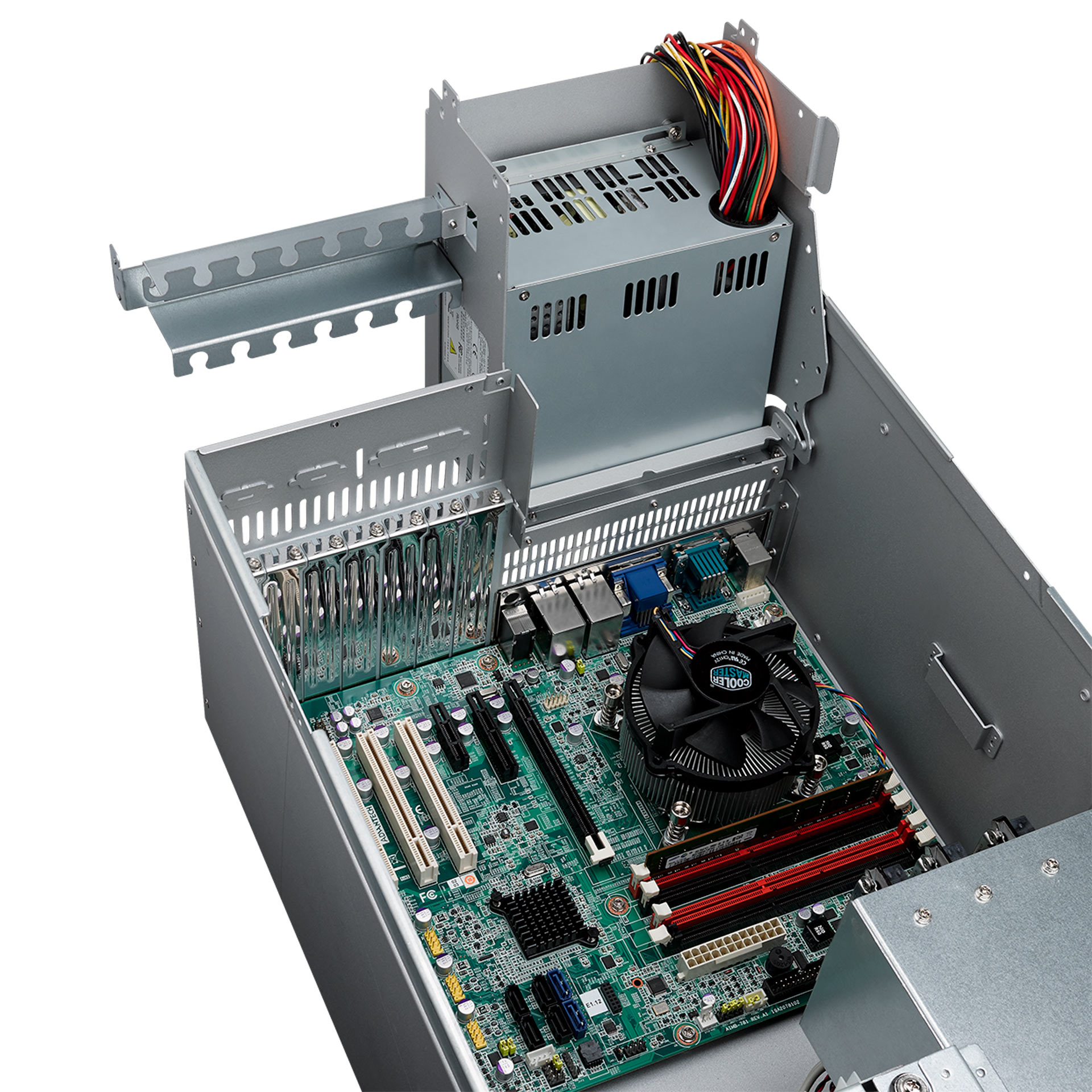 Der Lüfter ist hinter Staubfiltern geschützt und lässt sich wartungsfreundlich austauschen. Auch das Netzteil ist austauschbar. Das Gehäuse kann mit einem 5,25" Laufwerk sowie drei 3,5" Festplatten bestückt werden. Für die Konfiguration stehen eine große Anzahl unterschiedlicher ATX- und µATX-Mainboards zur Verfügung, sodass das System für viele Anwendungen in der Automation geeignet ist.