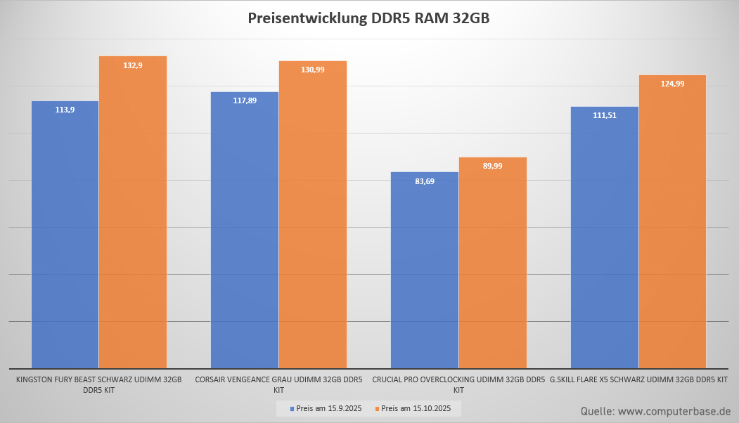 Steigende Preise für Arbeitsspeicher sind die logische Konsequenz. Besonders bei DDR4-Speicher kann man mittlerweile – trotz der angekündigten Produktionsverlängerungen durch fast alle RAM-Fertiger – einen starken Preisanstieg verzeichnen; allerdings wird die Produktion trotzdem überwiegend auf DDR5-Speicher konzentriert. Die Kosten für DDR5-Speicher sind allerdings auch im Zeitraum von Mitte September bis Mitte Oktober um ca. 15 % gestiegen.